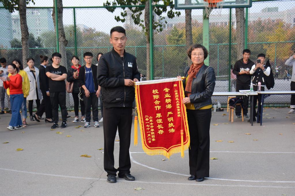 学校学生处李君处长,团委董雪、苏婧老师向获奖队伍颁奖,并向山东师范大学体育学院赠送锦旗表示感谢。篮球赛提高了同学们进行体育活动的热情和参加体育锻炼的积极性,培养了新生的集体荣誉感、责任感,增进了各个学院的友谊,进一步展现出我校学子奋勇拼搏,永不言弃的青春风采!(青年媒体中心 柴梅祎)