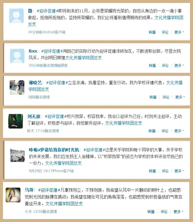 同学们在微博上纷纷以支持者、参与者的身份,表达了自己对迎评促建的理解与想法。2015级广播电视学专业的苏魏同学在微博中写道:“拒绝所拒绝的,坚持所荣耀的,我们必将看到,我们必将看到值得期待的结果”。也有冯璐同学说:“用自己的实际行动为迎评促建添砖加瓦,不断进取创新,尽显女院风采,共创明日辉煌”。